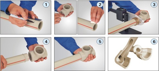 4、達(dá)到加熱時(shí)間后,立即把管材與管件同時(shí)取下,迅速無旋轉(zhuǎn)地直線均勻插入到所標(biāo)記的深度,使接頭處形成均勻凸緣。